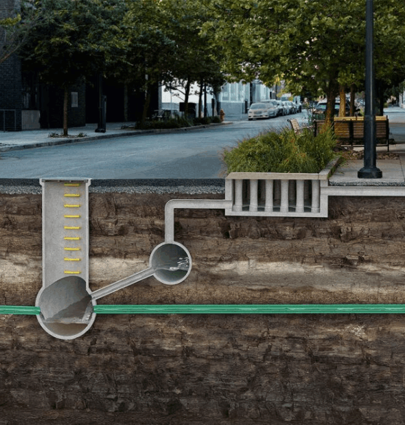 - Source control: Intercept and manage water at its point of origin. This includes features like green roofs and rain gardens.